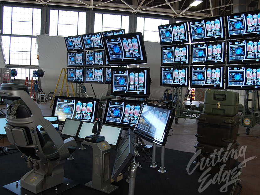 Feature films, TV shows, commercials and music videos are all utilizing more and more technology that appears on camera. For this military Command and Control Station we utilized over 50 LCD Monitors and Laptops. The monitors we use can be shot with traditional 35MM Film cameras, as well as with digital cameras like the RED EPIC and the ARRI ALEXA cameras. You can shoot at any frame rate desired, and we can also route any picture to any monitor. Please feel free to call us about your technology needs.